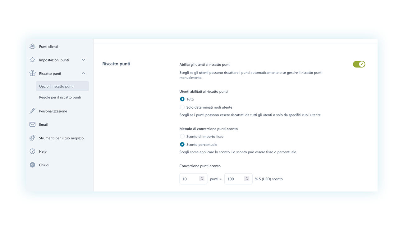 Il plugin ti permette di decidere in che modo vengono assegnati i punti, se automaticamente, manualmente, solo per alcuni utenti o tutti e con che rapporto spesa/punti:
