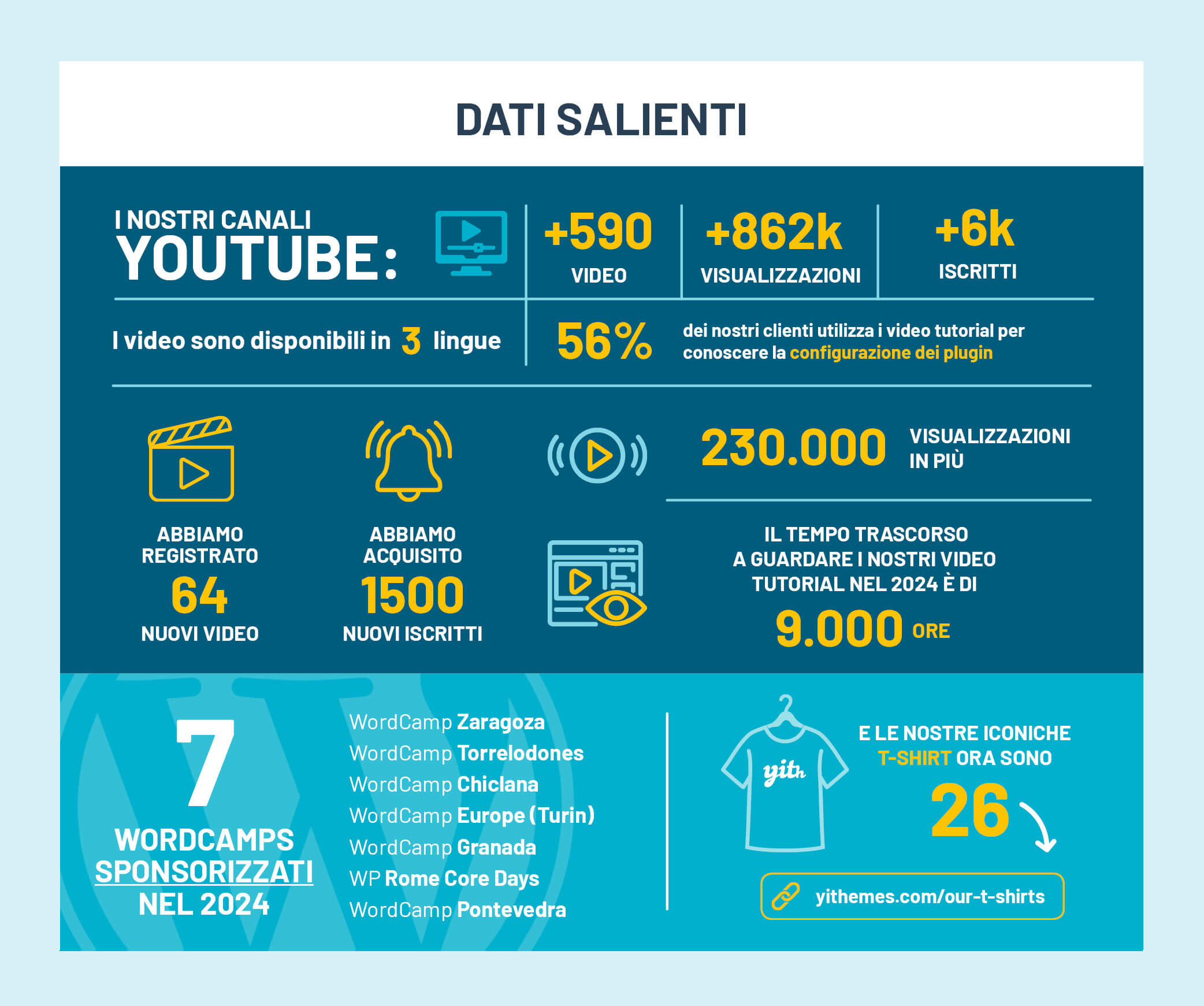 Uno degli ambiti in cui abbiamo continuato a crescere è quello dei nostri canali YouTube che contano ormai più di seimila iscritti e oltre 590 video (64 pubblicati nel 2024) disponibili in tre lingue: inglese, spagnolo e italiano. Nei video accompagniamo gli utenti passo dopo passo nella configurazione dei nostri plugin. Nel solo 2024, il tempo trascorso a guardare i nostri video tutorial è pari a 9000 ore!