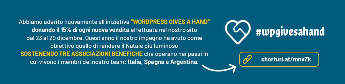 Crediamo fermamente che il Natale sia un momento per condividere e donare gioia ed è per questo che abbiamo aderito di nuovo all’iniziativa WordPress Gives a Hand, un progetto di WordPress a cui si sono unite anche altre aziende con l’intento di aiutare chi ha bisogno donando una percentuale di ogni vendita in beneficenza.